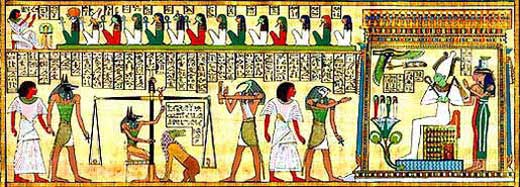 “Mielőtt a halott bejött a tárgyalóterembe, át kellett haladnia a kapuk és ajtók labirintusán, és helyesen kellett válaszolnia a kérdésekre, hogy átjusson. Aker oroszlánisten átengedte az utolsó kapun, és a Törvényszék tizennégy esküdttagjával állt szemben. Ott beszélhetett a földi viselkedéséről. (a fenti képen a bal felső sarokban látható), majd Anubisz isten bevitte a tárgyalóterembe, bemutatva neki a mérleget, ahol a szíve egyensúlyba kerül a tollal. Máat istennő, az igazság és a harmónia védőnője.Az eljárást Thoth – az írás és a bölcsesség istene – jegyezte le.Néha Thoth állata (pávián) ült a mérleg tetején, készen arra, hogy egy csúszó súly segítségével beállítsa az eredményt.”