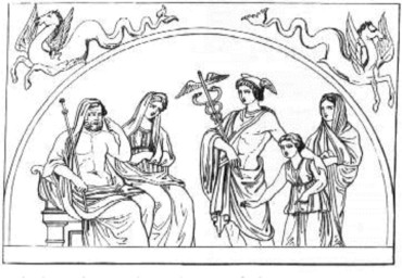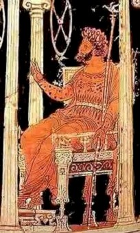 Fent: Hádész, az alvilág görög istene, a trónon, madárfejű botjával, a Kr.e. IV.-ben készült vörös alakos apuliai vázán. Lent: Az alvilág görög istenének, Hádésznek egy másik ábrázolása.