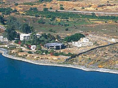 Galileai Kapernaum légi felvételről. Kapernaum romjain új ferences és görög templomok állnak.